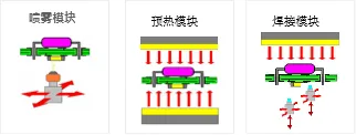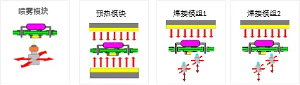 預熱模塊由底部預熱、頂部預熱、焊接保溫模塊組成。各溫區(qū)獨立循環(huán)、獨立控溫。可根據(jù)產(chǎn)品尺寸,自動關閉產(chǎn)品尺寸范圍外的加熱,節(jié)能簡單。