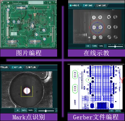 支持CAD、Gerber、坐標文檔、圖片文檔多種方式進行編程,標配示教相機,可在線視覺編程。支持離線編程。每個焊點參數(shù)都可獨立設置。全程可視化操作,在線調試方便快捷。自動優(yōu)化焊接順序,節(jié)省焊接時間。可提供MES系統(tǒng)接口。