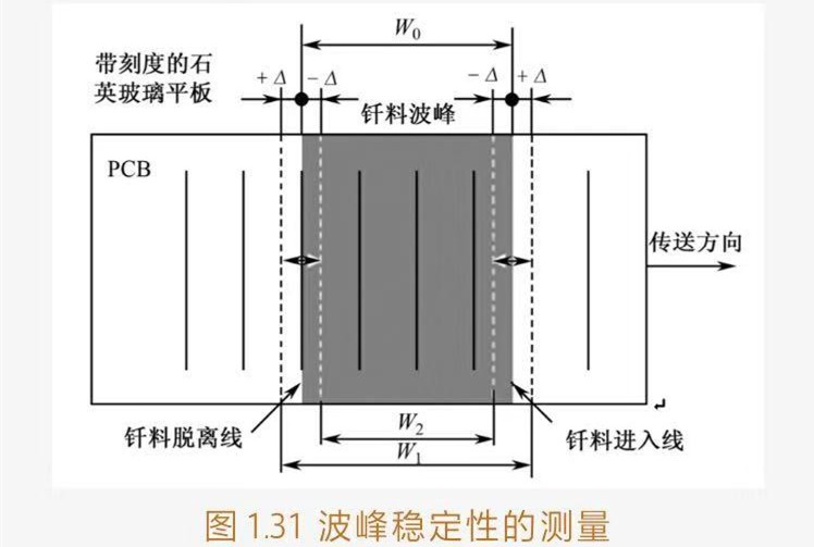 ?、蹨y試方法:將波峰高度調(diào)節(jié)至正常工作的高度H0上,然后將帶刻度的石英玻璃平板裝夾在傳送鏈上,將其運行至釬料波峰上調(diào)節(jié)好浸入深度,如圖131所示。觀測由于波峰高度的波動而導致玻璃平板上釬料波峰的進入線和脫離線之間闊度的變化[W2(Wo-2△)-Wo-W1(W0+2△)]。