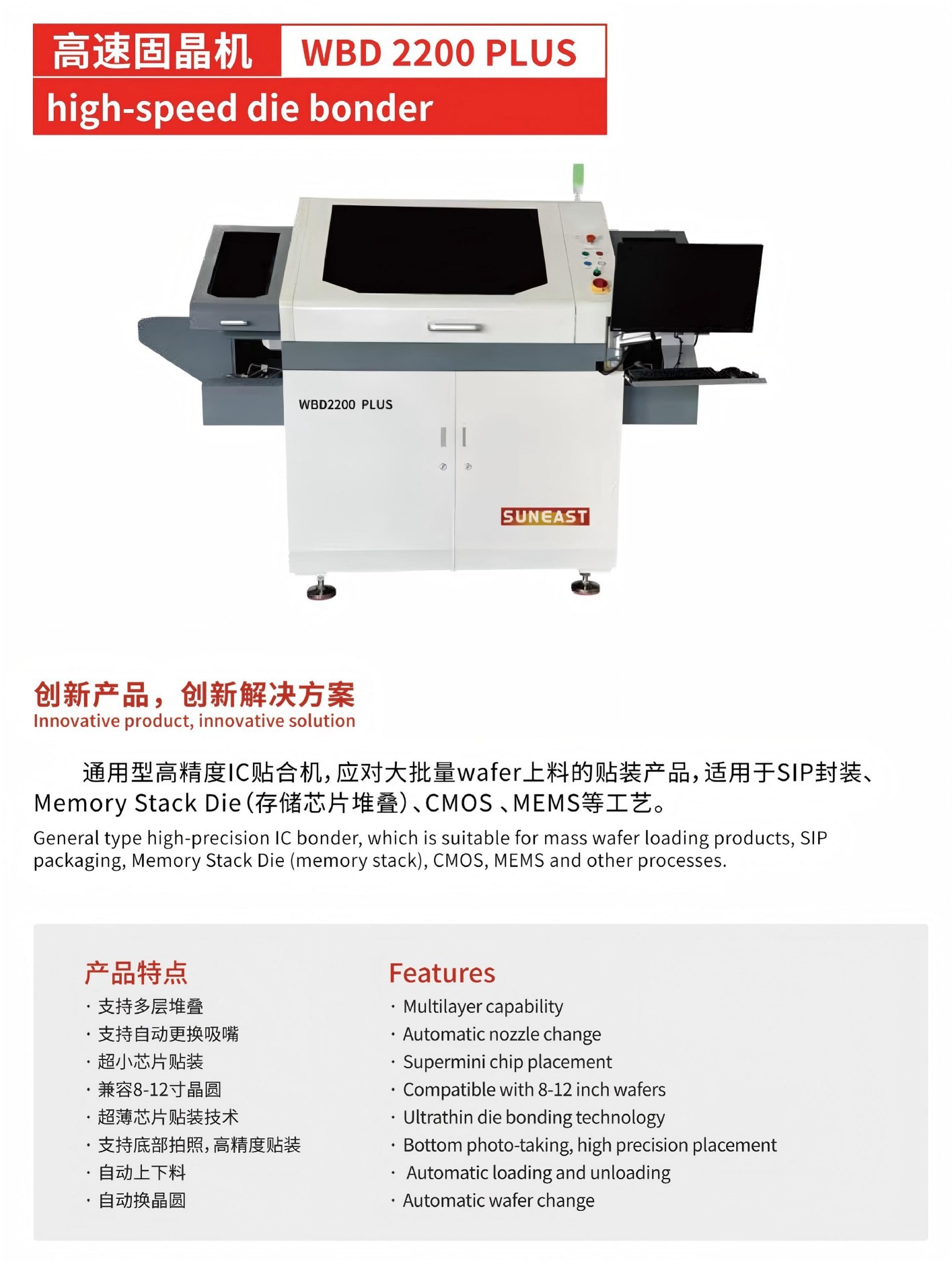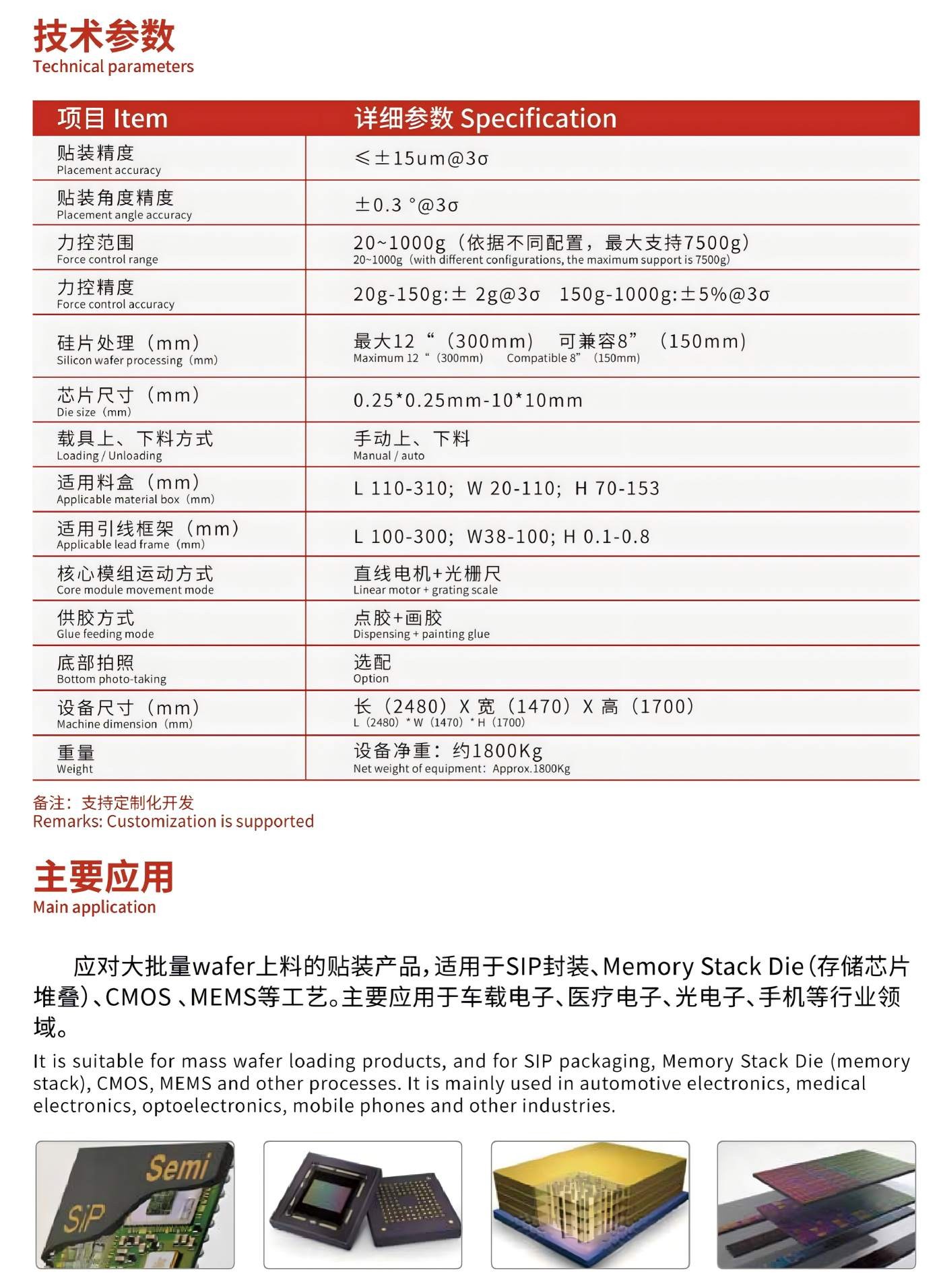 通用型高精度芯片貼合機,應對大批量wafer上料的貼裝產(chǎn)品,適用于SIP封裝、Memory Stack Die(存儲芯片堆疊)、CMOS 、MEMS等工藝。