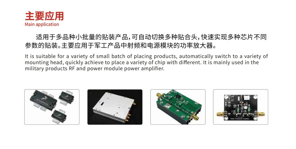 專用型高精度固晶貼合機,適用于多品種小批量的貼裝產品,可自動切換多種貼合頭,快速實現多種芯片不同參數的貼裝。主要應用于軍工產品中射頻和電源模塊的功率放大器。