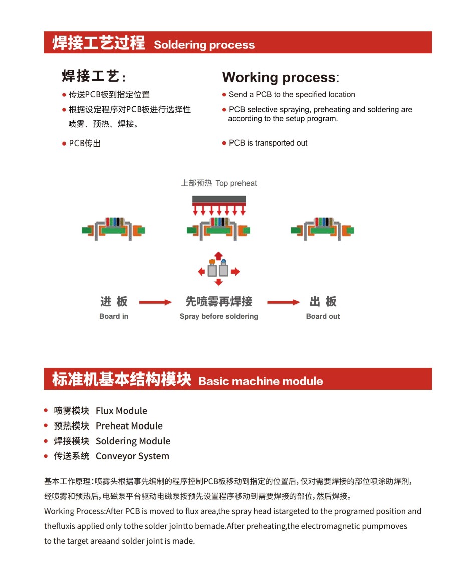 標(biāo)配噴霧、預(yù)熱和焊接單元,可以在較小的機器空間內(nèi)完成整個焊接工藝。
