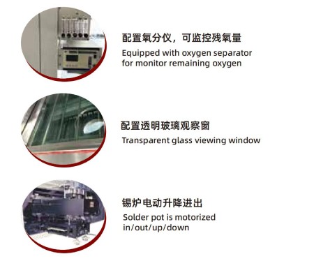 焊接系統:錫爐采用外熱式加熱,錫爐內膽采用鑄鐵制作,內表面防腐蝕處理;錫爐四周采用特制彈性材料密封,配置電動錫爐,錫爐可自由升降進出;